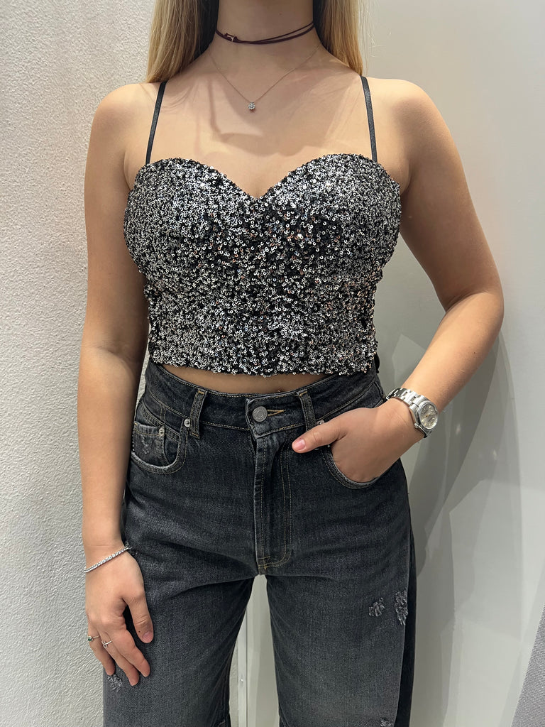 KONTATTO•Top bustino paillettes argento spallini regolabili