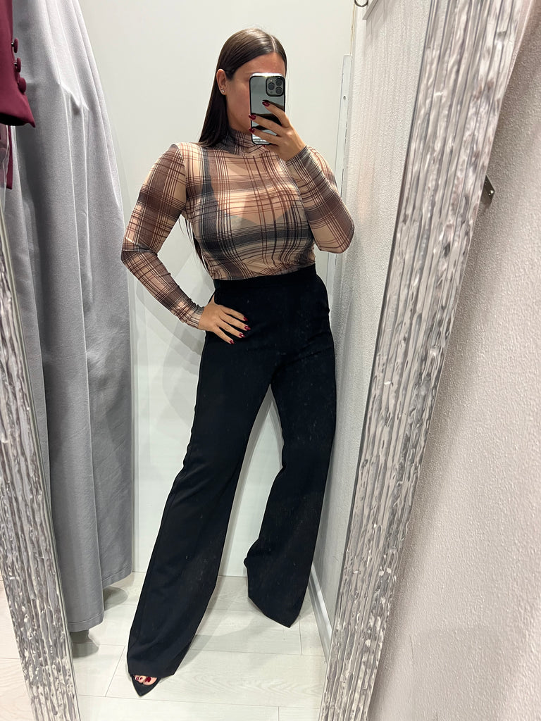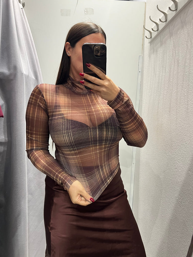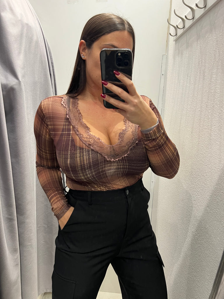 LUMINA•Body scollo v pizzo check mogano/ocra