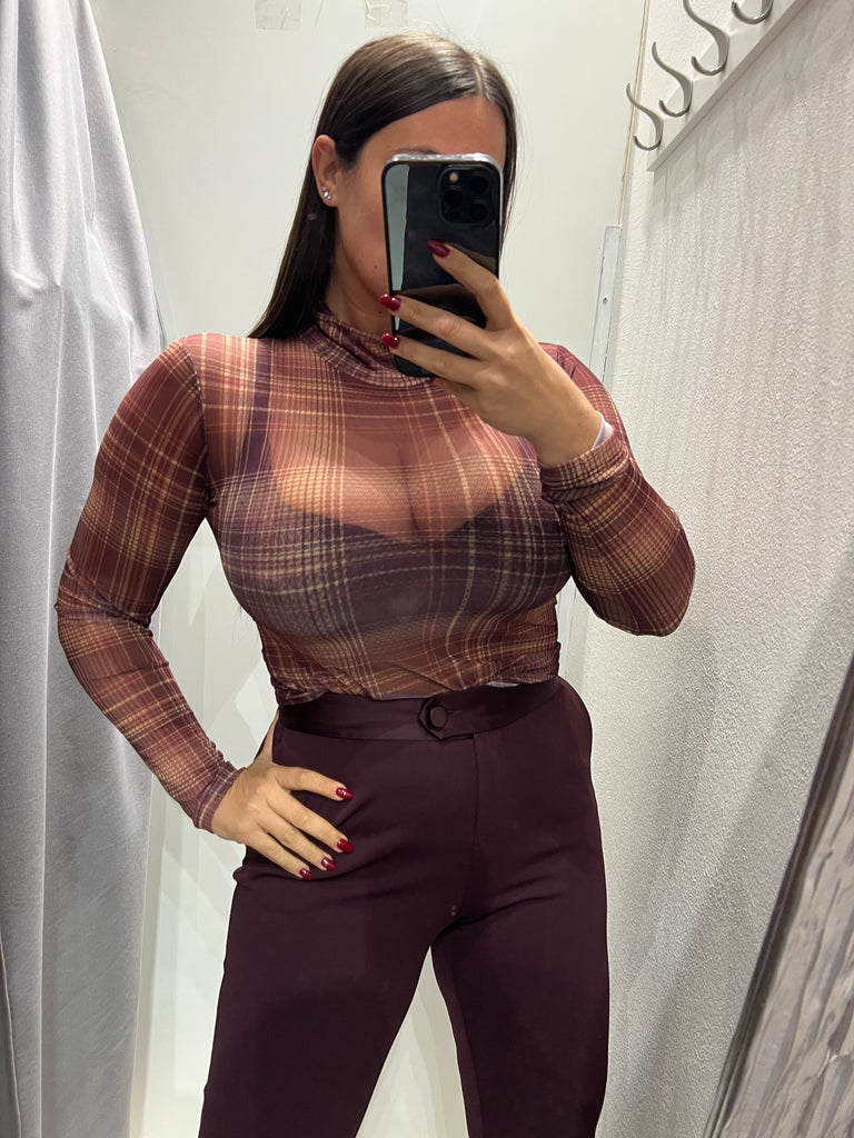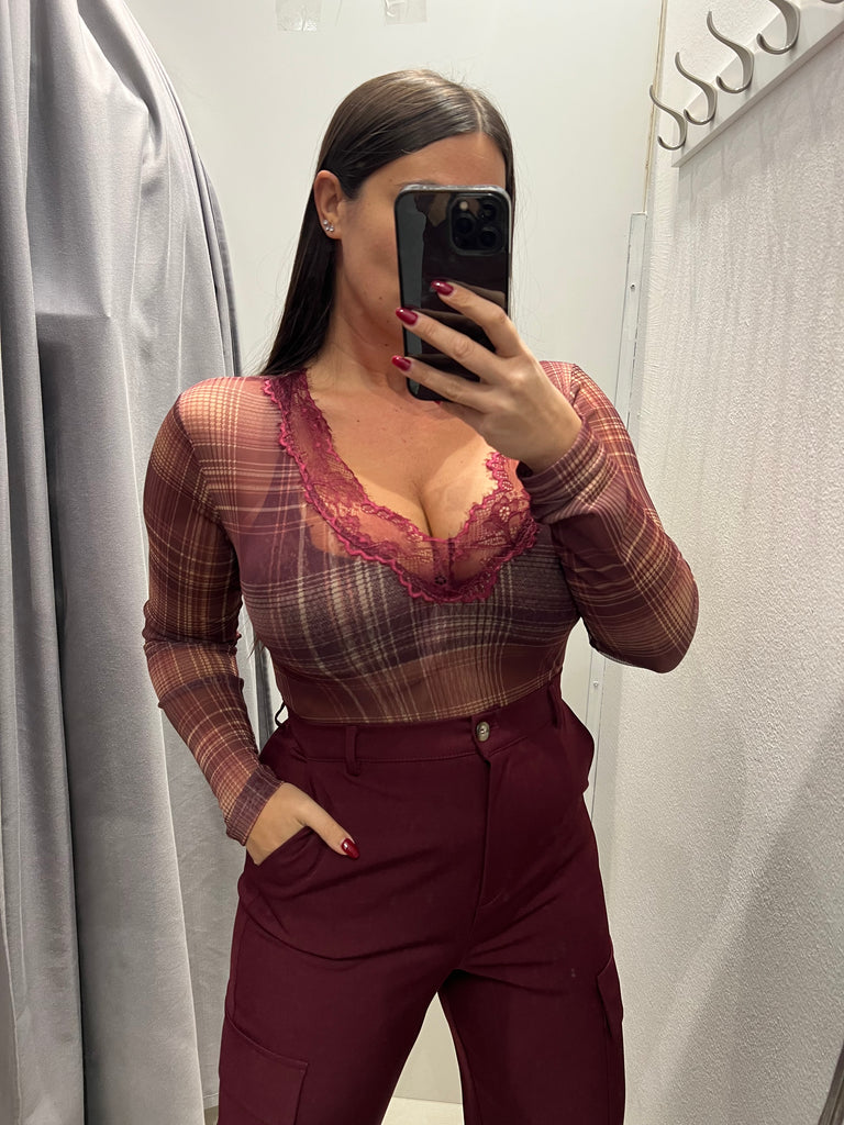LUMINA•Body scollo v pizzo check bordeaux/zucca/beige