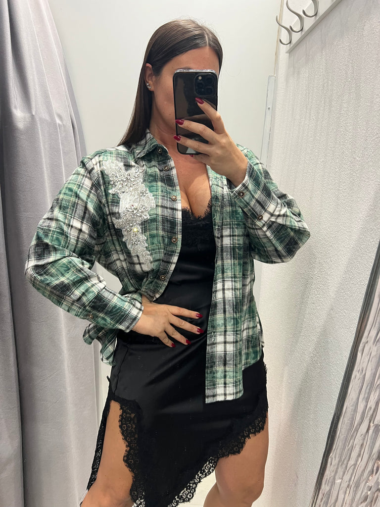 HaveOne•Camicia check in flanella verde cabochon strass