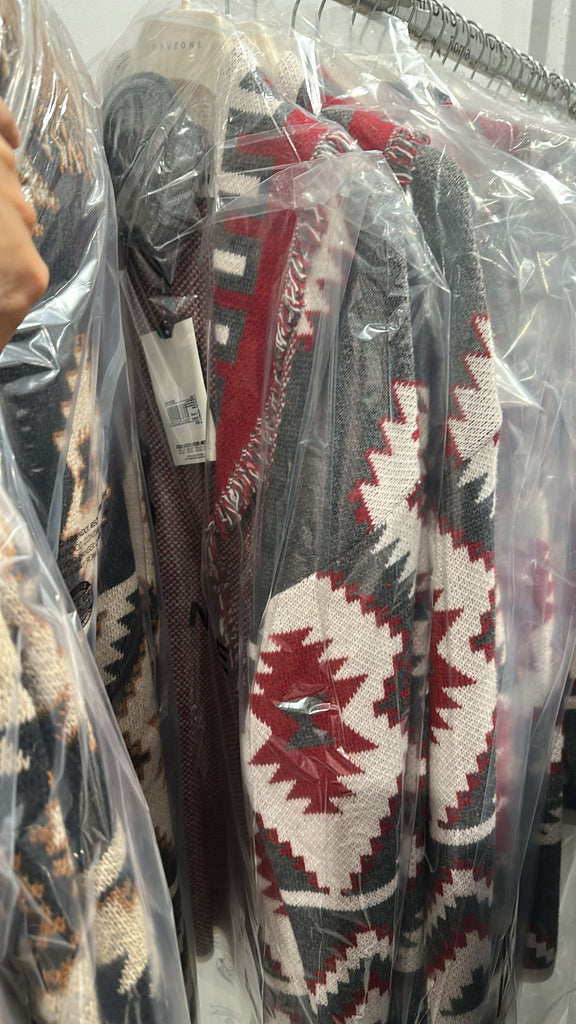 HaveOne•Cardigan fantasia etnica geometrica grigio/ciliegia/panna