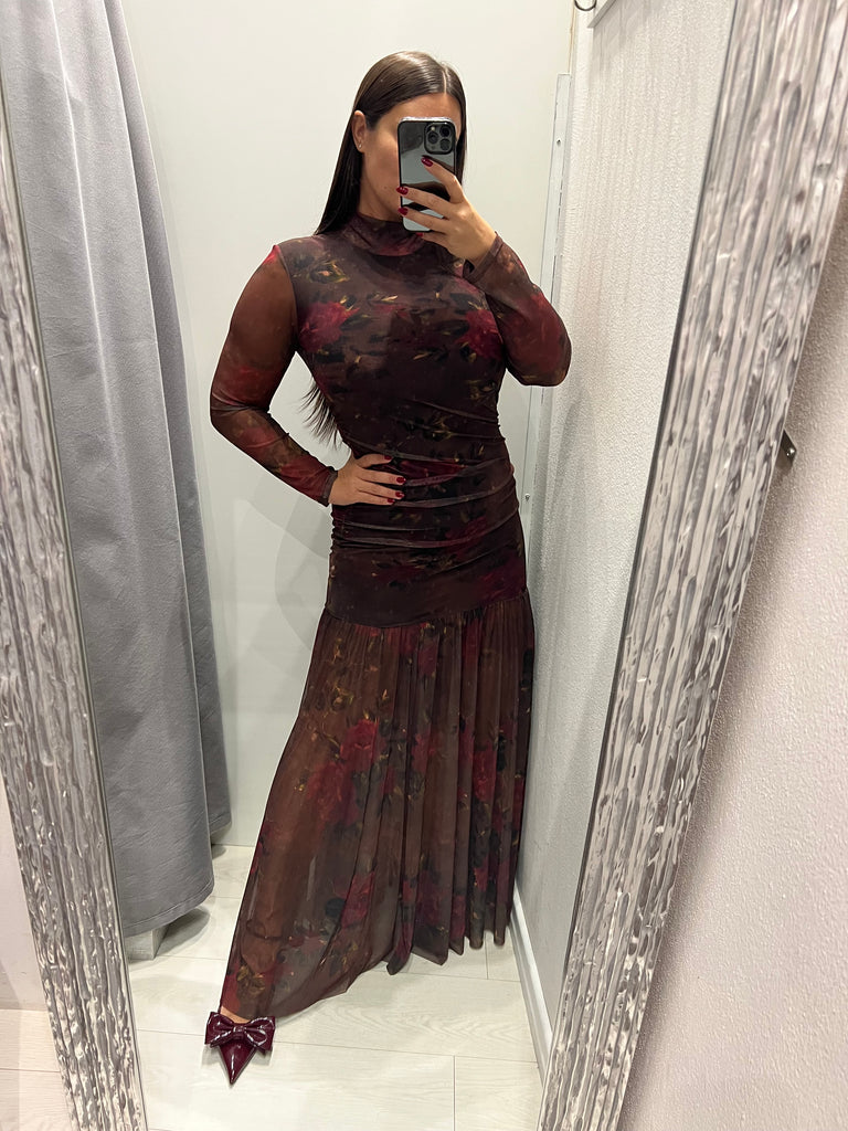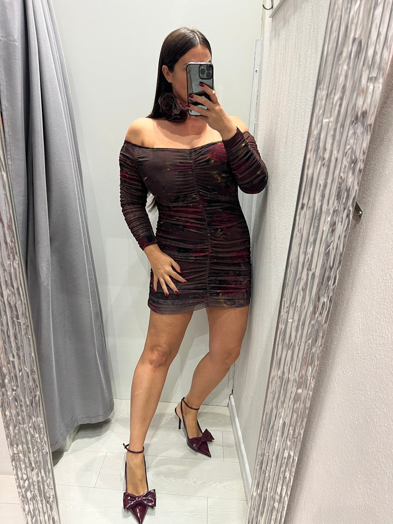 LUMINA•Abitino drappeggiato tulle floreale moro